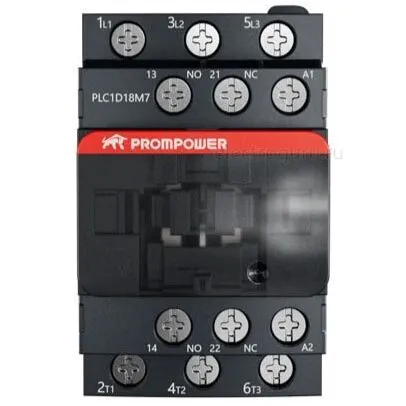 Контактор PLC1D18M7 серии Pulse от компании PROMPOWER представляет собой трёхполюсный электромеханический коммутационный аппарат, предназначенный для управления трехфазными электродвигателями и распределения электроэнергии в сетях с номинальным напряжением до 690В переменного тока частотой от 25 до 400Гц или до 300В постоянного тока.