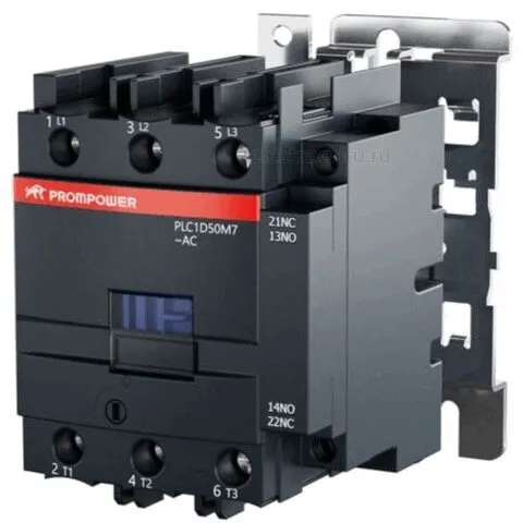 Контактор PLC1D50M7 серии Pulse от компании PROMPOWER представляет собой трёхполюсный электромеханический коммутационный аппарат, предназначенный для управления трехфазными электродвигателями и распределения электроэнергии в сетях с номинальным напряжением до 690В переменного тока частотой от 25 до 400Гц или до 300В постоянного тока.