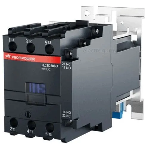 Контактор PLC1D80BD серии Pulse от компании PROMPOWER представляет собой трёхполюсный электромеханический коммутационный аппарат, предназначенный для управления трехфазными электродвигателями и распределения электроэнергии в сетях с номинальным напряжением до 690В переменного тока частотой от 25 до 400Гц или до 300В постоянного тока.