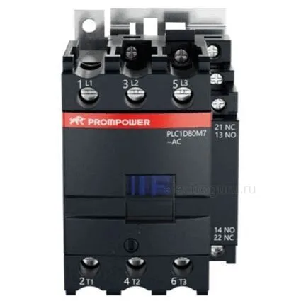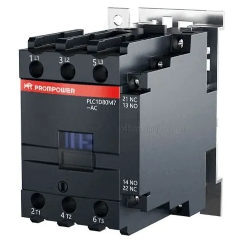 Контактор PLC1D80M7 серии Pulse от компании PROMPOWER представляет собой трёхполюсный электромеханический коммутационный аппарат, предназначенный для управления трехфазными электродвигателями и распределения электроэнергии в сетях с номинальным напряжением до 690В переменного тока частотой от 25 до 400Гц или до 300В постоянного тока.